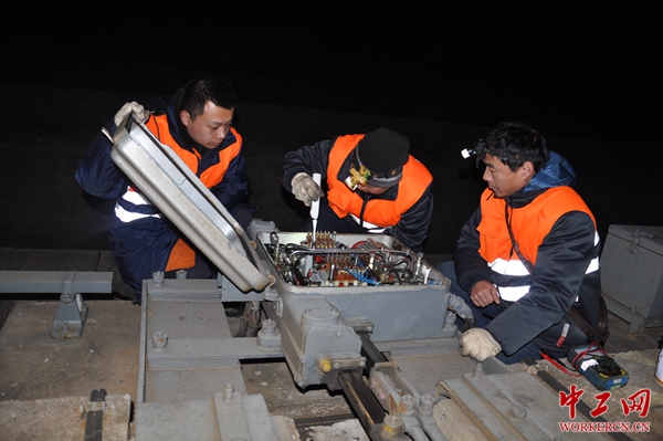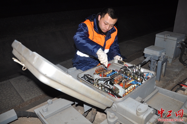 0时10分,“天窗修的时间下来了!”运转室内的值班员刘小东传达着消息;早已做好准备的信号工们便开始了设备检修作业。在冰冷的钢轨边,信号工们有的在弯着腰敲打设备上的螺栓,检查螺栓螺帽是否紧固;有的蹲在转辙机的旁边,检查内部的设备作用是否良好。由于动车的速度快,密度大,对设备的冲击力和挤压力也很大,很容易使紧固设备的螺栓松动;所以认真的检查、仔细的检修可以很大程度的减少列车运行中不安全隐患,保障旅客的出行安全。