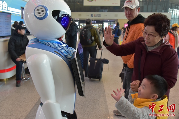 1月21日,春运首日,武汉车站的“头雁宝宝”机器人首次亮相,为旅客提供语音问询服务,旅客们纷纷前来“尝鲜”。(陈端 摄)