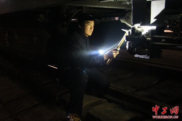 检车员吴航宇在对车辆制动系统进行检查、测试(高小龙摄)