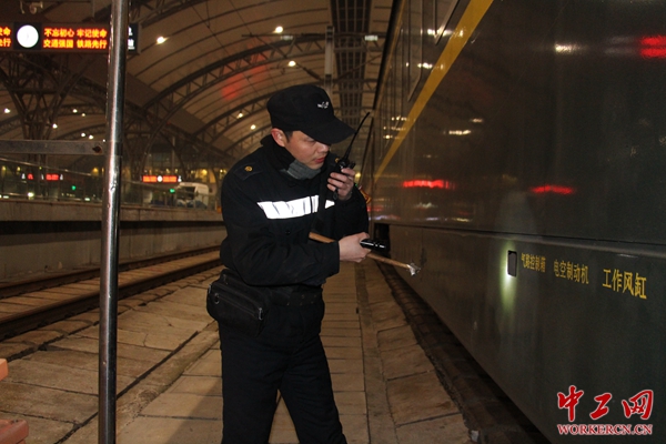 站台上驻站检车员吴强观察列车制动机状态,确保制动系统性能良好
