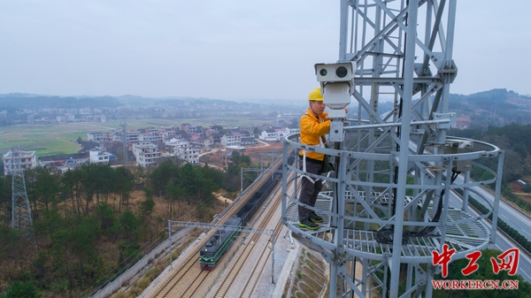 张贤正在对视频设备的电缆芯线进行检修作业。
