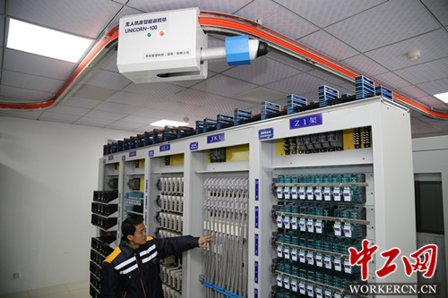 图为无人机房智能机正在机房内进行巡视(谢湘艳 摄)
