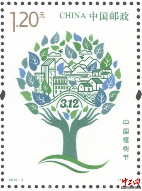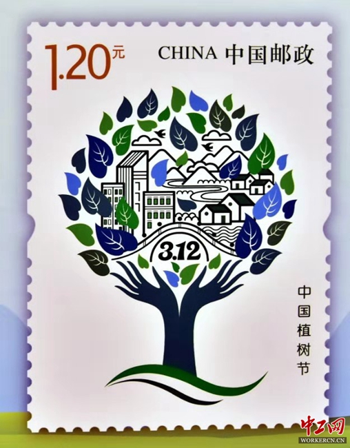 据介绍,1979年,五届全国人大常委会第六次会议决定,将每年的3月12日定为中国的植树节。首枚植树节纪念邮票,画面上是两只向上托起的手抽象处理化作树干,张开的五指意化为树枝,象征人人亲手植绿播绿,共同改善地球的生态环境。双手托起处有植树节的日期“3.12”。树干枝头上方是生机盎然的绿叶,层层绿叶中点缀了城镇乡村、河流山川和飞鸟白云,寓意通过植树造林,共同建设绿水青山的美丽中国。邮票印制使用绿色系专色油墨,在紫外灯光下会展现枝繁叶茂的景致、“40”和“履行植树义务,共建美丽中国”字样。