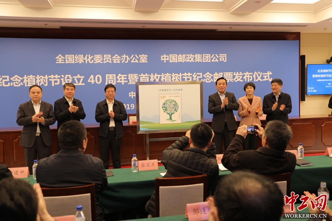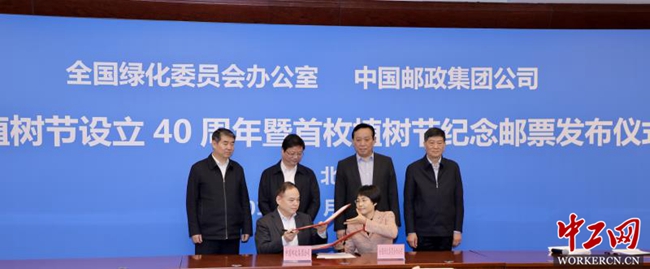 中工网讯(记者 王冬梅)3月11日,中国植树节设立40周年暨首枚植树节纪念邮票发布仪式在京举行。发布的首枚“中国植树节”纪念邮票1套1枚,面值1.20元。在发布仪式上,全国绿化委员会与中国邮政集团公司签署了合作框架协议。国家林业和草原局副局长刘东生、国家邮政局副局长戴应军出席发布仪式并为纪念邮票揭幕,全国绿化委员会办公室专职副主任胡章翠、中国邮政集团公司副总经理张荣林代表双方签署合作框架协议。