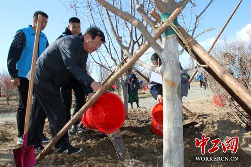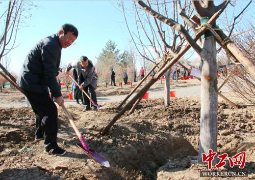 部长们集体乘车来到植树地点后,一下车就拿起铁锹投入到植树劳动中,自动结成劳动小组,相互配合着扶正树苗、回填泥土、围堰浇水,共同栽下油松、银杏、国槐、玉兰、海棠等树木2000余株。