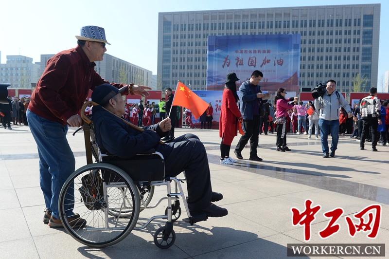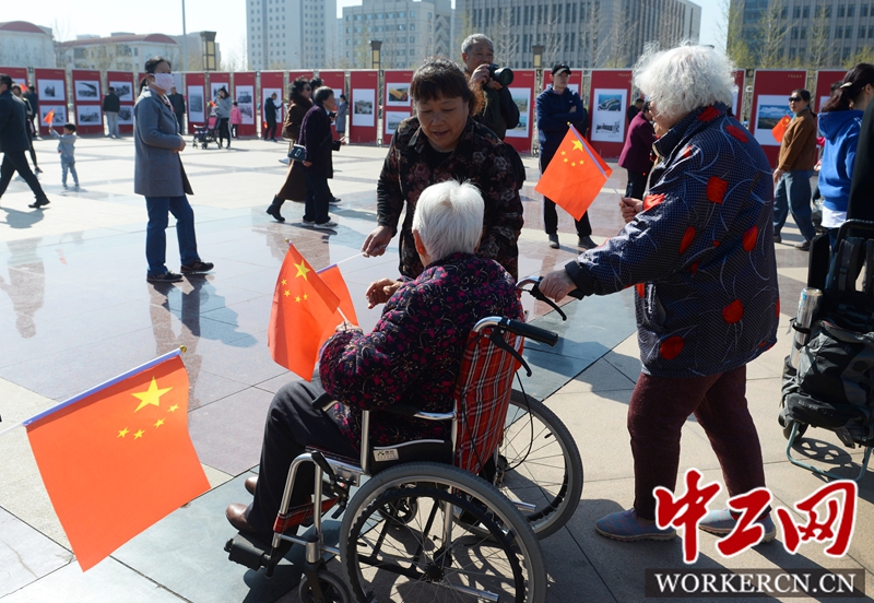 行动不便的老人也在儿女的帮助下来到广场观看。