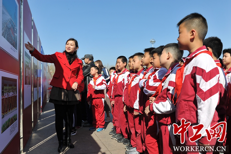 附近学校的学生们在认真听取老师介绍照片里的故事。
