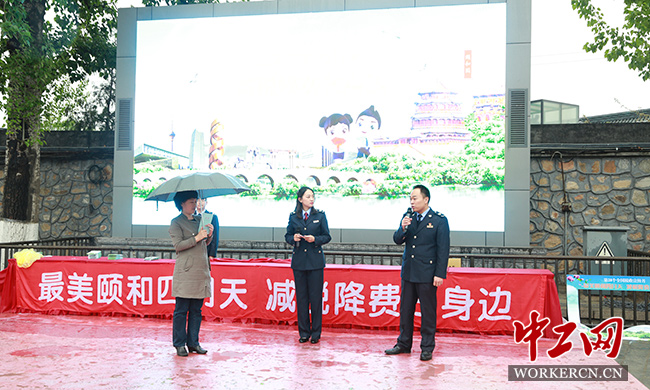 下午2 点,税收宣传活动在颐和园八方亭前热闹开场。减税降费的宣传展板、“最美颐和四月天 减税降费在身边”的横幅标语依次排开,LED 显示屏不断滚动播放减税降费宣传片和个税改革宣传视频,来往游客纷纷驻足观看。