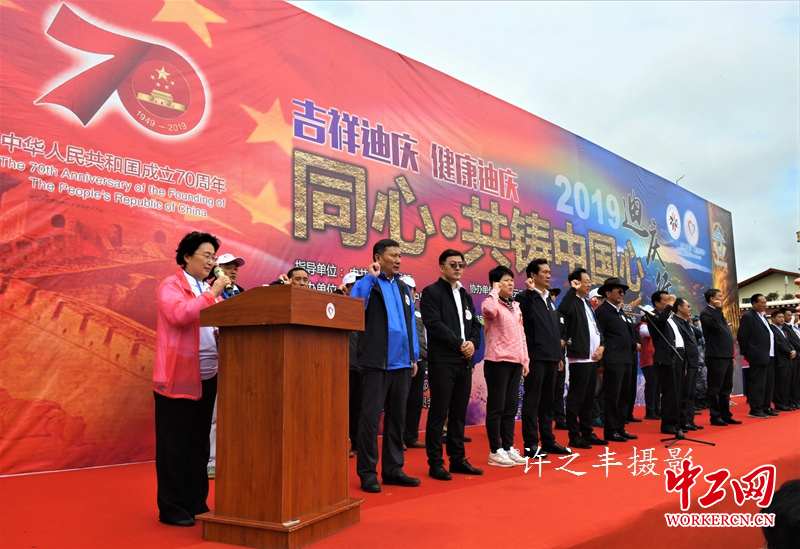 值此新中国成立70周年之际,在中央统战部的指示下,应云南省迪庆藏族自治州邀请,“同心·共铸中国心”将于2019年7月7日至14日,在迪庆全州多地举办爱心巡访主题活动。推动改善迪庆州医疗卫生条件,树立当地群众健康意识,共同探索构建首都医疗资源与迪庆州支持帮扶长效机制。来自全国各地750名医疗专家和志愿者参加此次活动。图为7月8日上午,在云南迪庆州香格里拉月光广场举行“同心·共铸中国心”2019迪庆行启动仪式。工人日报-中工网许之丰摄影报道