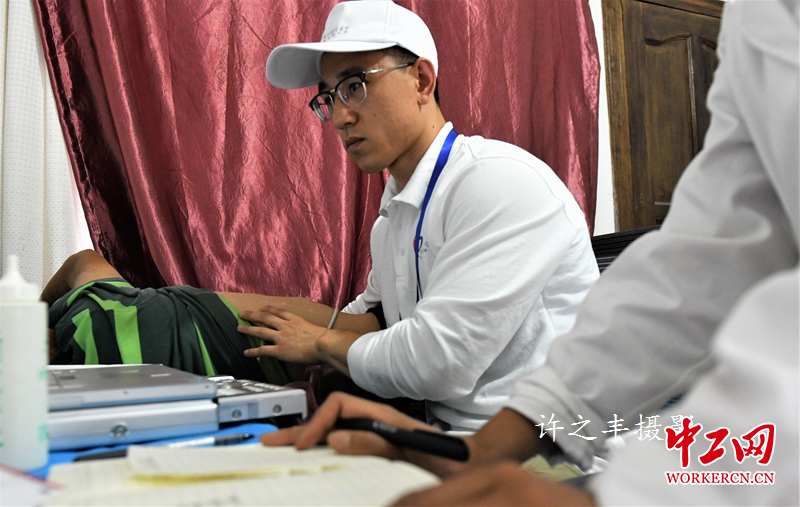 2019年7月9日,“同心·共铸中国心”2019迪庆行医疗专家志愿者59人,来到云南德钦县拖顶傈僳族乡,这里位于滇西北独有的“三江”(怒江、澜沧江、金沙江)并流地段,由西向东流入金沙江,山区、河谷是本乡的地势特征,全乡共1879户,78个生产小组,共有人口9609人。医疗专家志愿者在乡卫生院,全天义诊1126人次;捐赠药品金额150239元;入户慰问两户;先心病筛查共普查儿童334名,其中3名先心病患儿。图为医疗专家在拖顶乡卫生院给百姓看病治病的情景。工人日报-中工网许之丰摄影报道