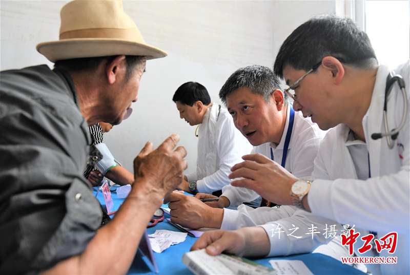 2019年7月9日,“同心·共铸中国心”2019迪庆行医疗专家志愿者59人,来到云南德钦县拖顶傈僳族乡,这里位于滇西北独有的“三江”(怒江、澜沧江、金沙江)并流地段,由西向东流入金沙江,山区、河谷是本乡的地势特征,全乡共1879户,78个生产小组,共有人口9609人。医疗专家志愿者在乡卫生院,全天义诊1126人次;捐赠药品金额150239元;入户慰问两户;先心病筛查共普查儿童334名,其中3名先心病患儿。图为医疗专家在拖顶乡卫生院给百姓看病治病的情景。工人日报-中工网许之丰摄影报道
