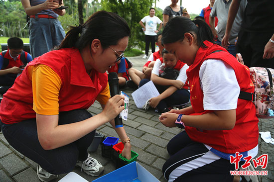 中工网讯(记者刘友婷 通讯员操留剑 黄敬涵)青山绿水靠守护,碧海蓝天你我他。7月8日下午,中建二局二公司联合深圳市莲花山U站和深圳南海中学七(二)班,共同开展了“校企携手——‘同在蓝天下,环保靠大家’莲花山公园环保行”活动。100余名中学生、义工老师齐聚在美丽的莲花山公园,参与了一场生动的垃圾分类教育实践活动。