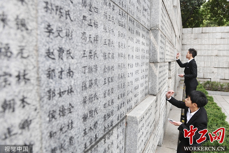 2019年11月18日,南京审计学院的大学生志愿者在为遇难者名字描新。