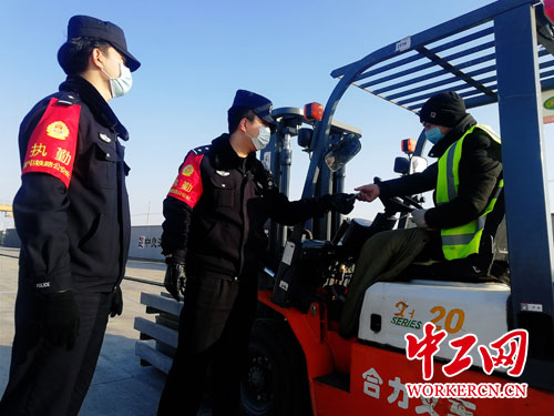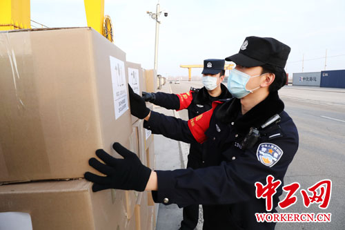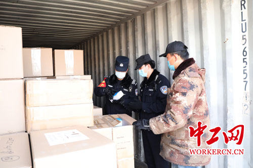 随着企业复工有序推进,新疆霍尔果斯口岸铁路进出口货运量稳步增长,中欧班列开行规模随之增加,多批从国外采购的防疫物资通过铁路运输进入国内,为确保中欧班列防疫物资转运安全有序,2月27日,乌鲁木齐铁路公安局奎屯公安处霍尔果斯站派出所民警前往霍尔果斯口岸铁路换装库区对当日由霍尔果斯转运乌鲁木齐的防疫物资进行安全检查。