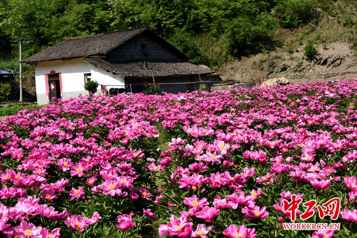 湖北郧阳在产业扶贫上大力推广既能致富又能带动乡村旅游的种植业,340多个村共种植芍药、药牡丹、白芨等各种药材2万多亩;劳动节刚好是盛花期,花开引来八方游客前来观赏游玩。(中工网记者邹明强 通讯员周家山)