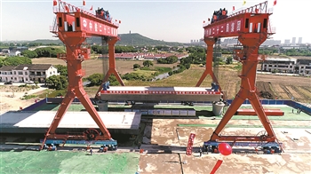 5月12日,中铁二十二局集团建设者将一片千吨高铁箱梁放置在江苏南沿江城际铁路跨疏港特大桥14号至15号桥墩之间,这是国内首条大规模采用千吨箱梁高铁工程架设的首片千吨箱梁。