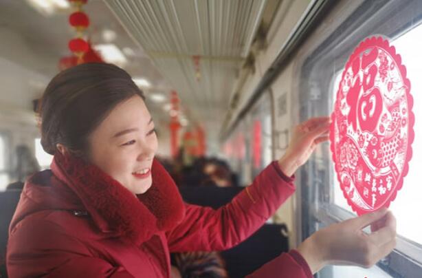 近日,为营造春节节日氛围,吉林至图们4343/4344绿皮火车的乘务班组提前将车厢贴满了福字、窗花和红灯笼、大红鱼,布置得张灯结彩,年味十足。