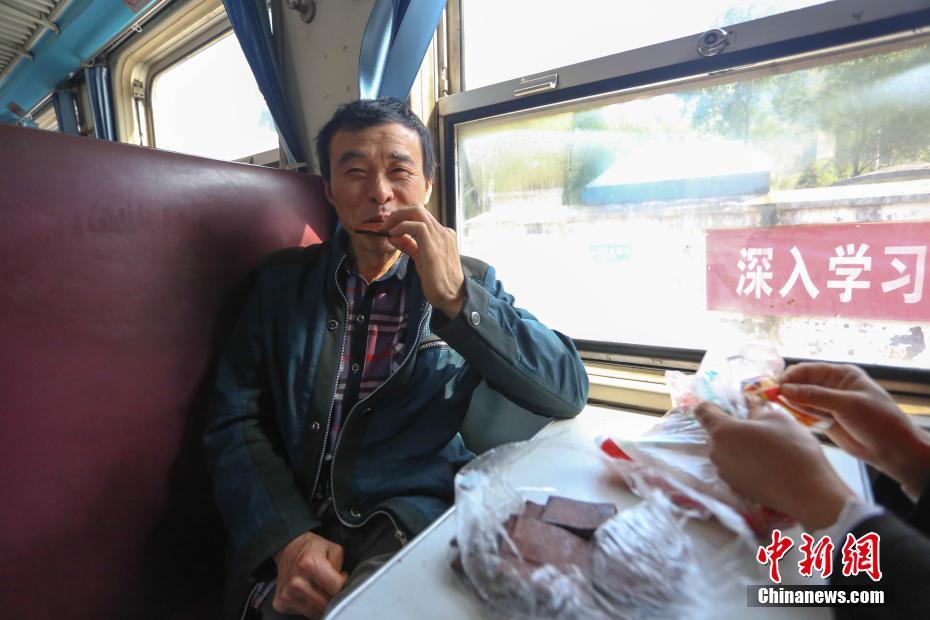 5630次列车上,一旅客正在品尝来自板桥的特色豆腐干。高明洁/文 包亮/图