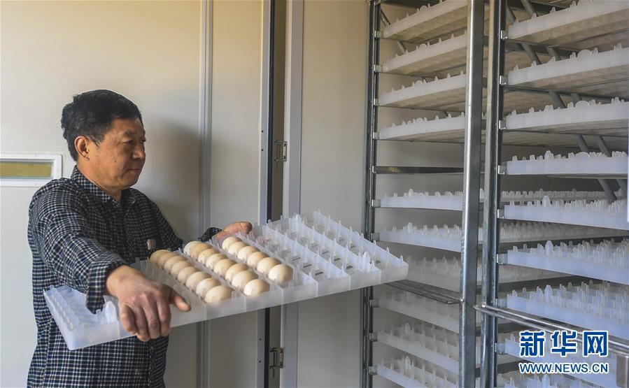 4月8日,河北省衡水市故城县蓝海孔雀养殖基地技术员把孔雀蛋放入孵化机。近年来,河北故城县鼓励农民创新创业,大力发展蓝孔雀特种养殖,采用“公司+农户+基地”的经营模式,带动农民增收和脱贫致富。目前,全县存栏孔雀5000余只,形成孵化、饲养、观赏、加工、销售一条龙。新华社记者 李晓果 摄