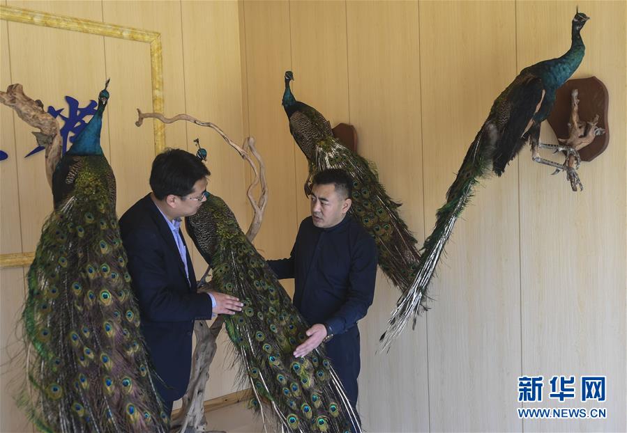 4月8日,河北省衡水市故城县蓝海孔雀养殖基地负责人在向客户介绍孔雀产品情况。近年来,河北故城县鼓励农民创新创业,大力发展蓝孔雀特种养殖,采用“公司+农户+基地”的经营模式,带动农民增收和脱贫致富。目前,全县存栏孔雀5000余只,形成孵化、饲养、观赏、加工、销售一条龙。新华社记者 李晓果 摄
