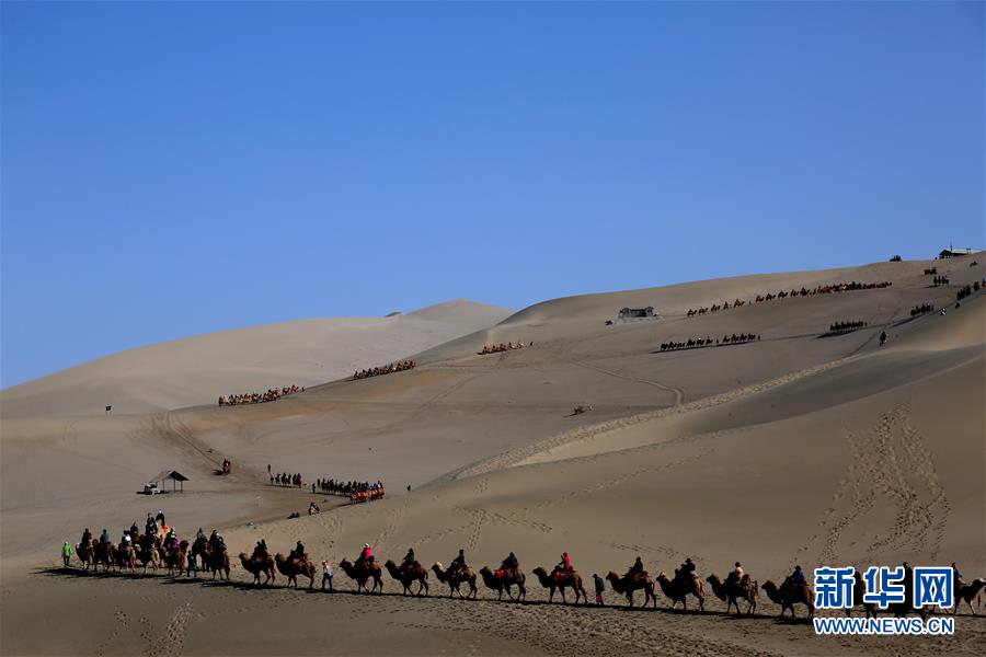 4月5日,游客在甘肃省敦煌市鸣沙山月牙泉景区参观游览。记者从文化和旅游部了解到,在文化和旅游部新组建后迎来的首个小长假中,全国共接待国内旅游总人数1.01亿人次。 新华社发(张晓亮 摄)