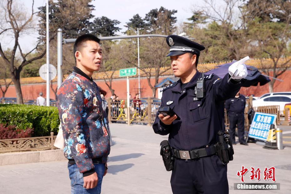4月8日,聂建春在岗位上为民众指路。 中新社记者 韩海丹 摄