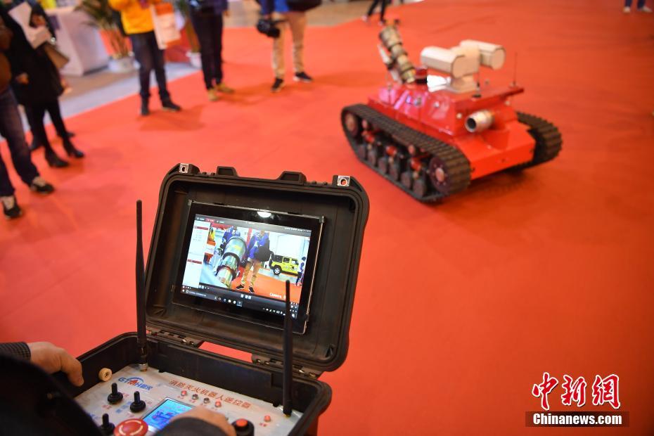 4月16日,价值120万元的智能型消防灭火机器人亮相。当日,第二届中国(昆明)东南亚·南亚消防安全暨应急救援技术展览会在昆明开幕。现场设立多个专业主题区域,展示包括抢险救援器材、消防车辆、无人机、灭火机器人等最新技术及消防装备。中新社记者 刘冉阳 摄
