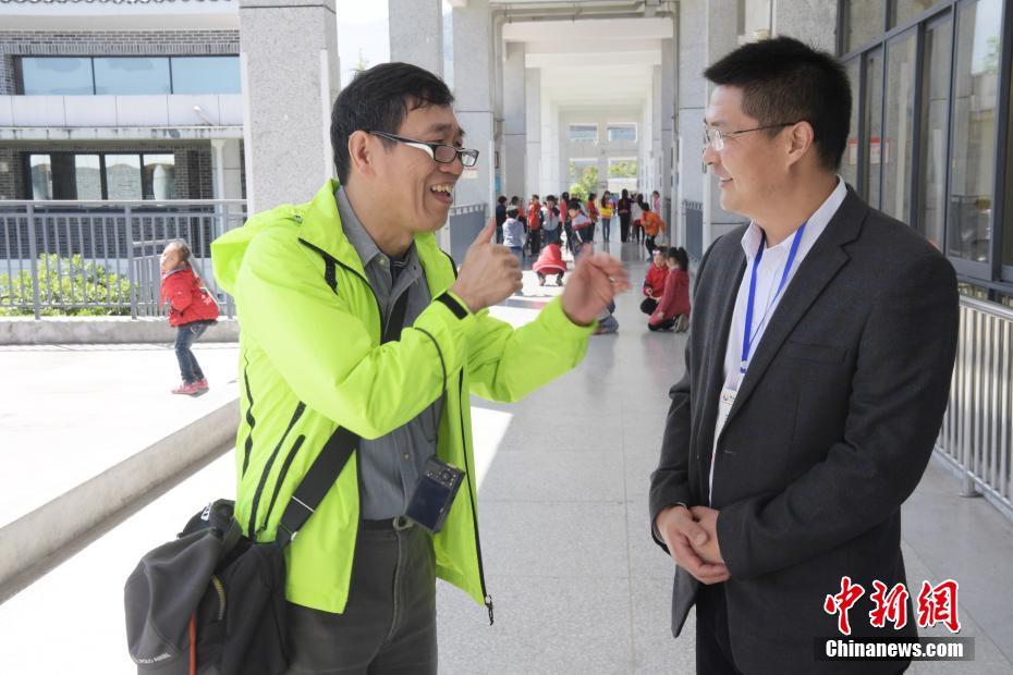 距离4.20芦山地震已过去五周年。4月15至17日,中新社记者走进四川雅安雨城区、芦山县、汉源县等多地,实地探访芦山地震灾后壹基金五年来的援建项目。图为台湾建筑设计师周子艾(左)与芦山县第二小学校长交流。中新社记者 陈文 摄