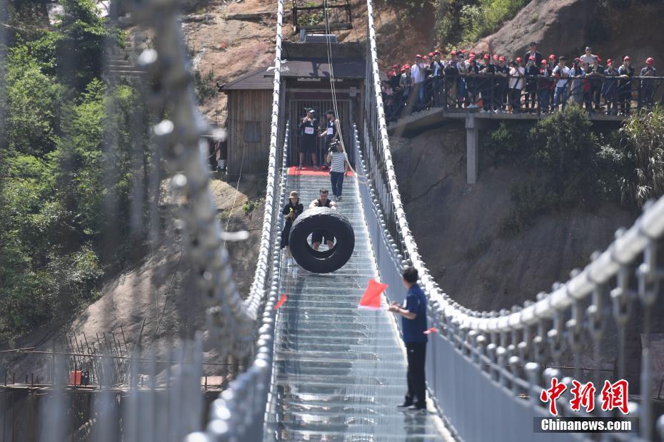 4月18日,来自中国、俄罗斯、乌克兰的中外大力士齐聚湖南平江石牛寨,参加首届中外大力士玻璃桥翻轮胎大赛。选手们需在近200米长的玻璃桥赛道上,徒手翻动200公斤重的轮胎,最先抵达终点者胜出。图为个人竞速中,首位出场的乌克兰大力士马克西姆翻动轮胎冲向终点。杨华峰 摄