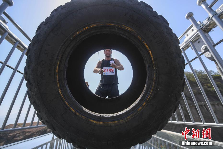 4月18日,来自中国、俄罗斯、乌克兰的中外大力士齐聚湖南平江石牛寨,参加首届中外大力士玻璃桥翻轮胎大赛。选手们需在近200米长的玻璃桥赛道上,徒手翻动200公斤重的轮胎,最先抵达终点者胜出。图为大力士在玻璃桥上翻动轮胎。杨华峰 摄