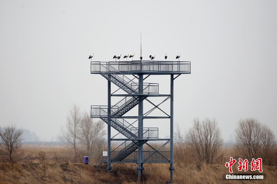 近日,黑龙江省嘟噜河湿地自然保护区迎来数万只候鸟群,其中包括国家一级保护动物东方白鹳数十只。嘟噜河湿地自然保护区位于黑龙江省萝北县南部,松花江北岸。保护区总面积19967公顷,核心区面积7588公顷。这里地势低洼,泡泽相连,苇草丛生,是中国北方三大水禽栖息地之一和候鸟迁徙坐标区。图为东方白鹳在嘟噜河湿地保护区观光塔上休息。中新社发 胡振辉 摄