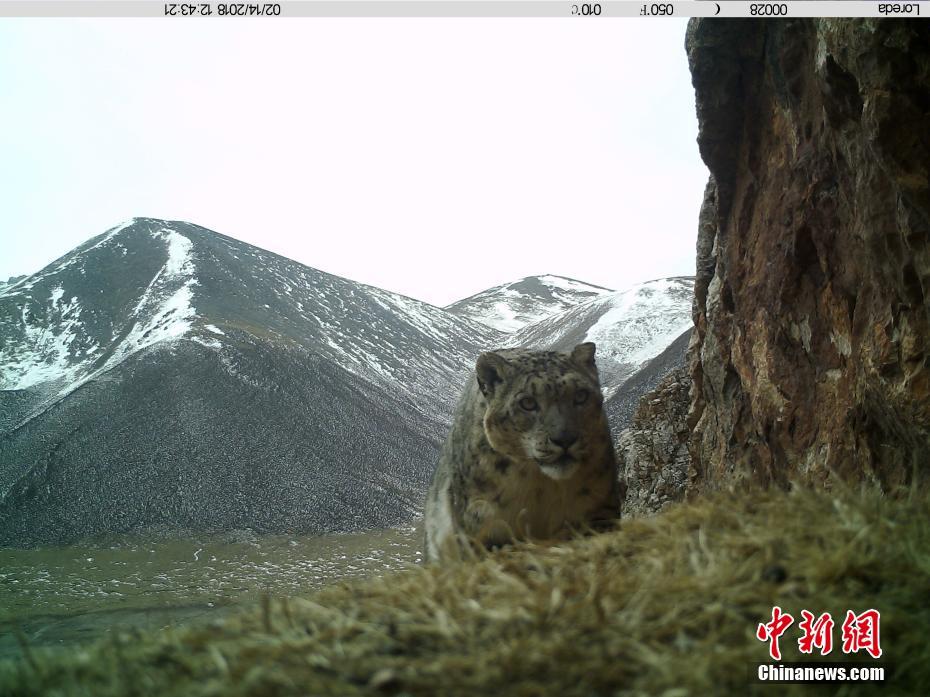4月19日,青海环保组织原上草自然保护中心对外发布,2017年11月以来,在藏区神山阿尼玛卿地区进行大规模雪豹调查时,红外相机除记录到雪豹以外,还记录到多种野生动物的影像。图为雪豹。原上草自然保护中心供图