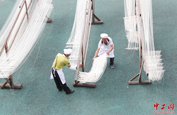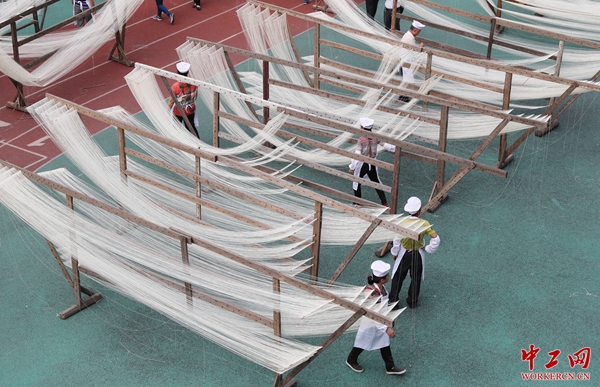 中工网讯(记者王维砚)一个个高两米、长六七米的木质面架在操场上整齐排列,线面手艺人们穿梭其间,拉面成丝,一架架线面在阳光下如瀑布,似细纱。4月21日上午,由福州市晋安区总工会主办的“劳动美•古早味”后屿线面技能竞赛在鼓山中心小学开赛,18位来自鼓山镇的后屿线面手艺人参加了角逐。图片摄影 薛晓秋