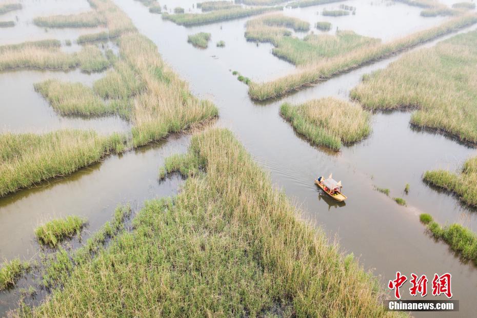4月22日,航拍江苏高邮湖,游客乘坐游船穿行“芦苇迷宫”,感受大自然的气息。中新社记者 泱波 摄