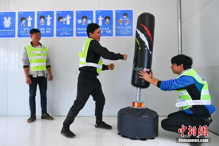 4月24日,建筑工人在宣泄室内打拳击。当日,中国建筑二局西南分公司位于昆明的一工地内,安装有沙包、减压玩具和涂鸦板的“宣泄室”正式投入使用。据了解,此举旨在为建筑工人减压释压,保持其身心健康。 中新社记者 任东 摄