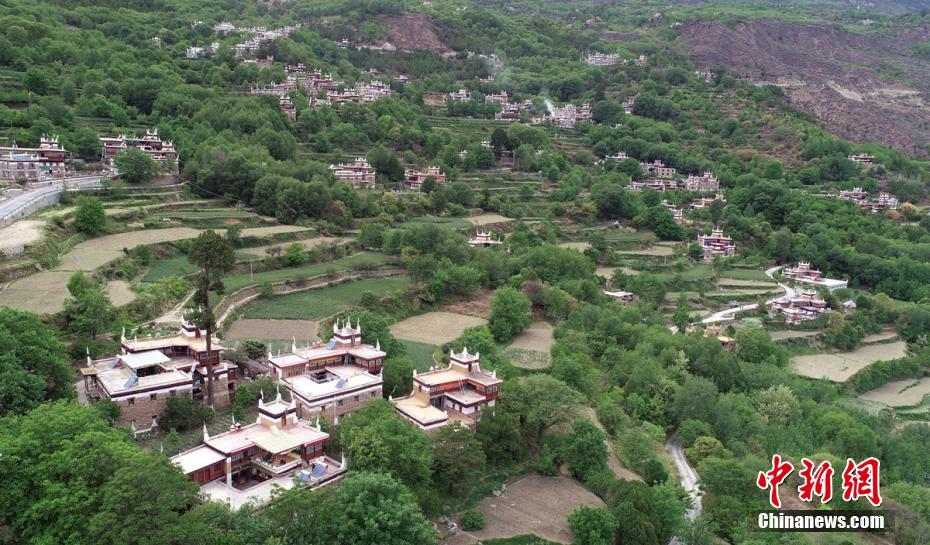 甲居藏寨依着起伏的山势迤逦连绵,在相对高差近千米的山坡上,一幢幢藏式楼房洒落在绿树丛中。 刘忠俊 摄