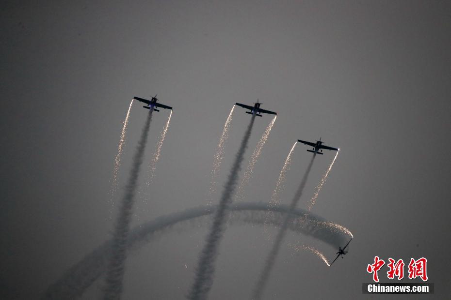 本届航展室内展览面积达2.5万平米,室外展览面积达10万平米,参展商超过200家,参展航空器233架,其中固定翼飞机、直升机174架,各类型公务机18架,飞机型号达80多种。累积表演飞行时间172小时52分钟,表演起降523架次。 图为飞机焰火点亮夜空。 王中举 摄
