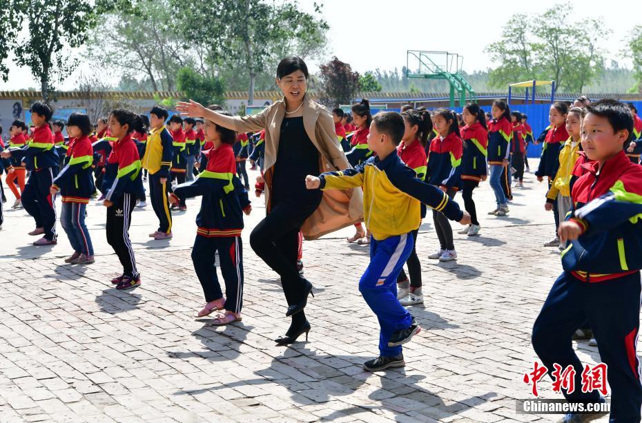 5月4日,河北邢台平乡县东庙小学广场上,赵秀格正与孩子们一起“锻炼”。中新社记者 翟羽佳 摄