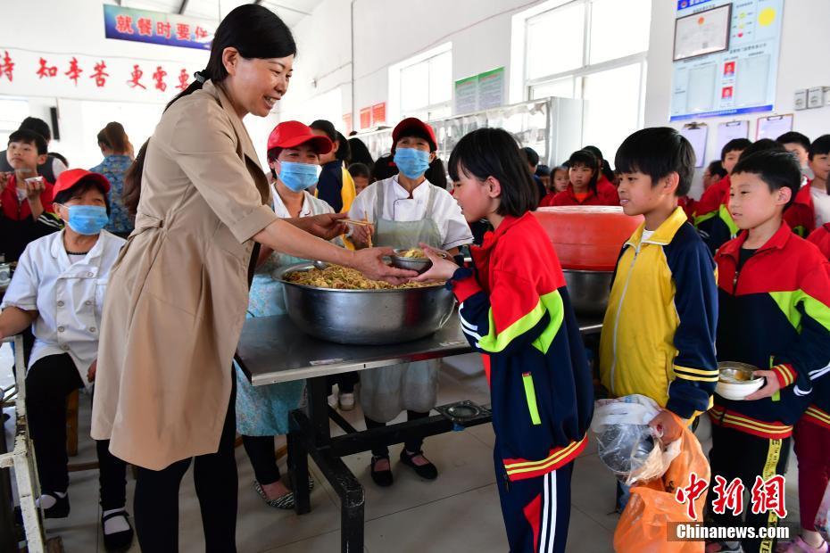 5月4日,河北邢台平乡县东庙小学饭堂,赵秀格帮着给孩子们打饭。中新社记者 翟羽佳 摄