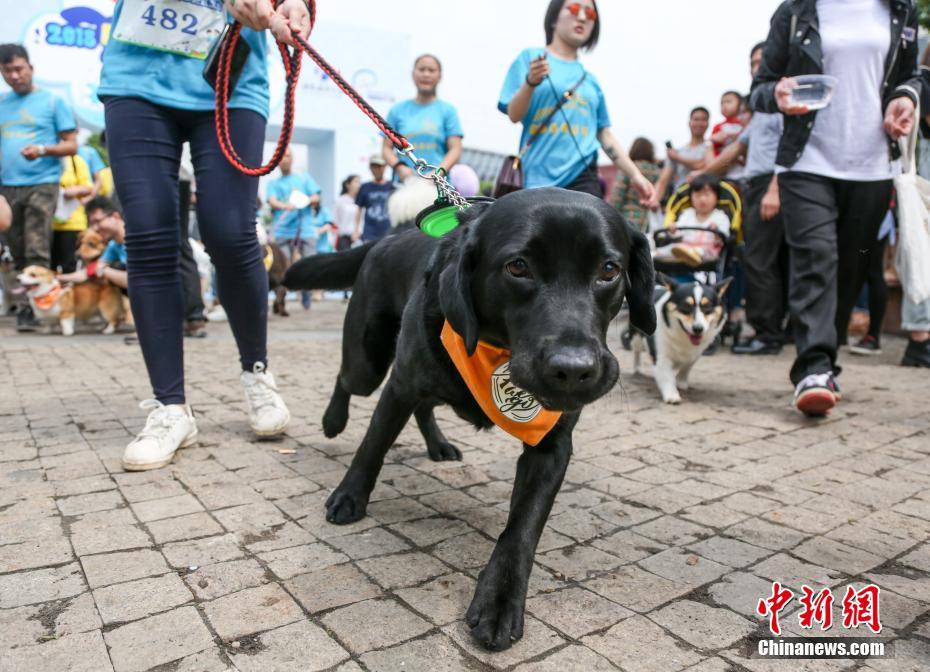 5月5日,众多民众带着宠物狗前来参赛。当日,一场狗狗“马拉松”活动在武汉海昌极地海洋举行。近千只宠物狗在主人的带领下完成了近5公里的赛程,挑战各种趣味赛道,萌态百出。 中新社记者 张畅 摄