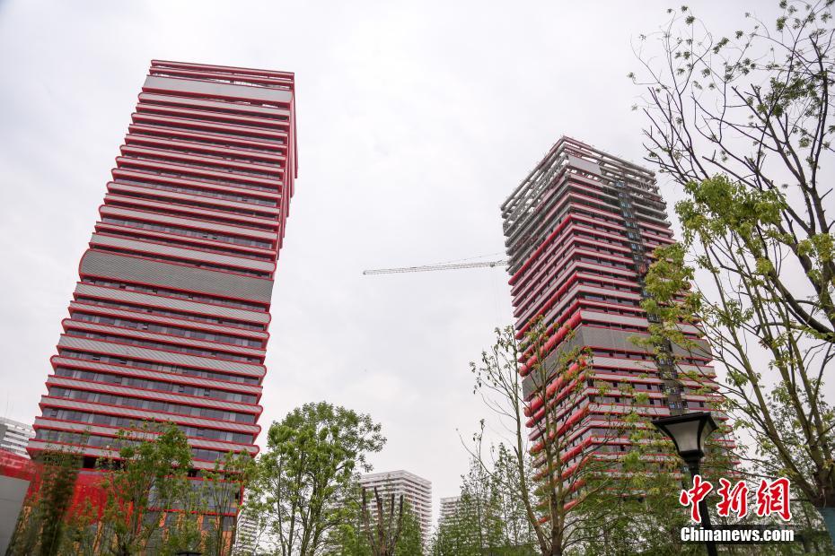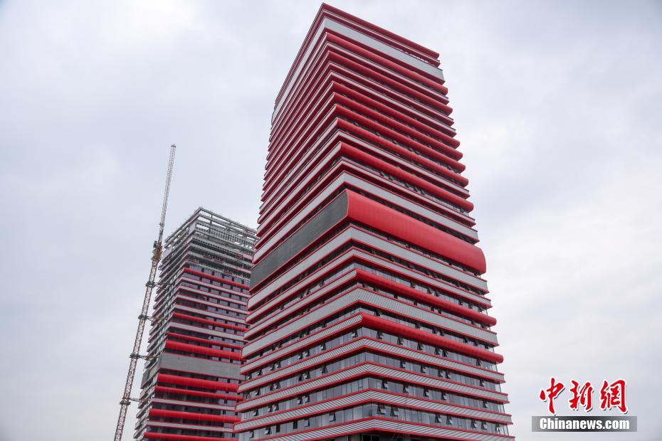5月5日,武汉金银潭大道旁,两栋正在建设中的大楼外观奇特,远远看去就象一本一本红色的书叠在一起。 中新社记者 张畅 摄