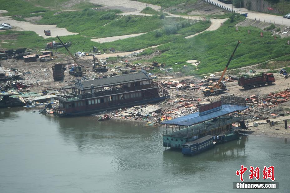 5月7日,重庆江北区相国寺嘉陵江边多艘已被拖移上岸的非法餐饮船正在接受拆解。在接下来一段时间里,还将有一批类似餐饮船陆续运抵此处进行拆解。至此,盘踞在江北长江、嘉陵江水域长达二十余年的非法餐饮船,即将在江北区的重拳整治下销声匿迹。 中新社记者 陈超 摄