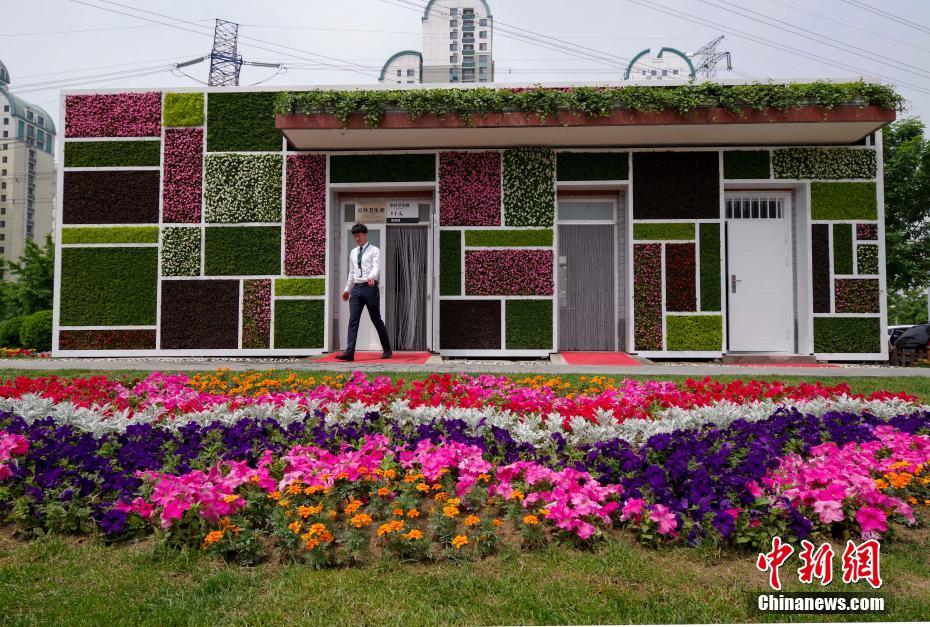 5月7日,位于北京市丰台区的一所经立体绿化改造的公厕引人注目。该公厕外墙分成大小不等的格子,里面栽种了海棠花、五色草等植物,对厕所进行了“立体绿化”。 中新社记者 贾天勇 摄