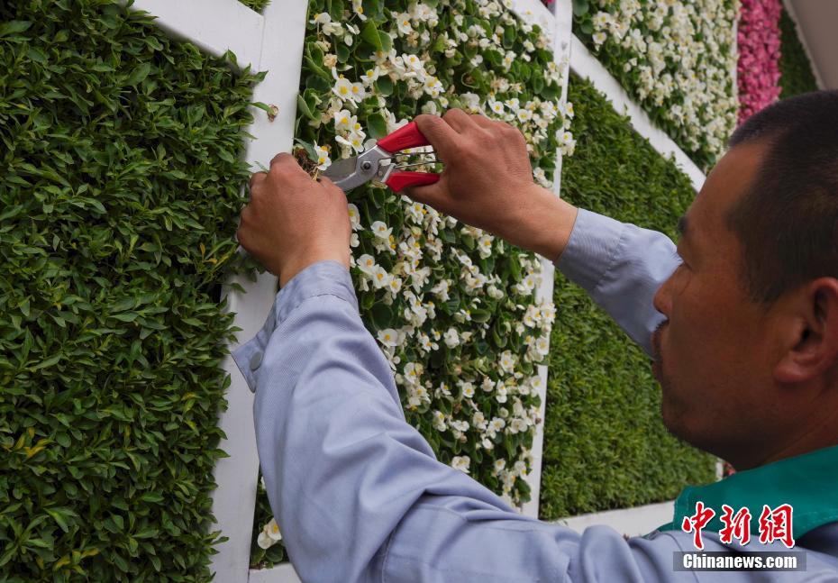 5月7日,北京市丰台区的一所经立体绿化改造的公厕外,一名园艺工人修剪外墙植物。该公厕外墙分成大小不等的格子,里面栽种了海棠花、五色草等植物,对厕所进行了“立体绿化”。 中新社记者 贾天勇 摄