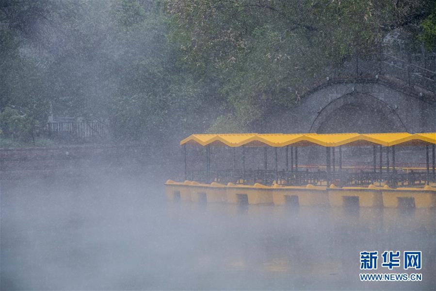 这是5月7日在乌鲁木齐市人民公园拍摄的雪中游船。 新华社记者胡虎虎摄
