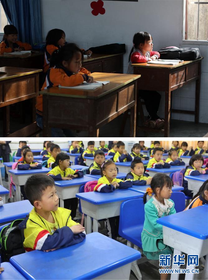 拼版照片:上图为7岁的李晓彤(右一)在华山小学教室内晨读(4月27日摄);下图为7岁的李晓彤(前排左二)在黔西县第十小学教室内上课(5月7日摄)。新华社记者 欧东衢摄