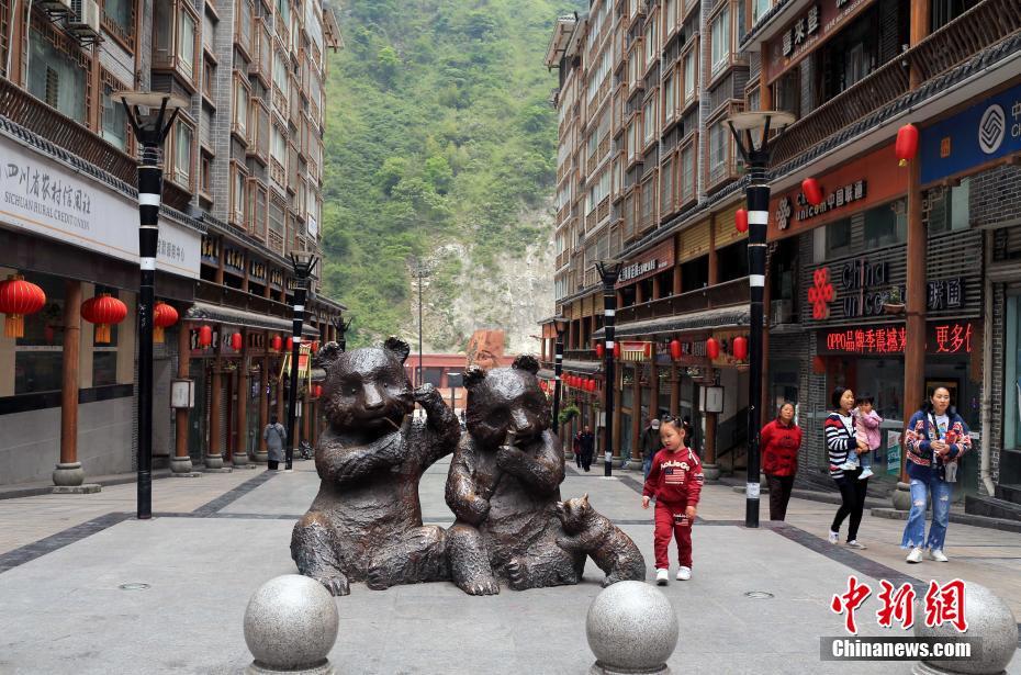5月8日,“熊猫古城”街头的大熊猫雕塑。经历了汶川特大地震、芦山强烈地震以后的四川宝兴县,通过灾后重建着力推进熊猫古城相关配套设施和重要节点建设,将其打造为川西大熊猫生态旅游环线上最具代表性、标志性的精品旅游景区。 中新社记者 王磊 摄