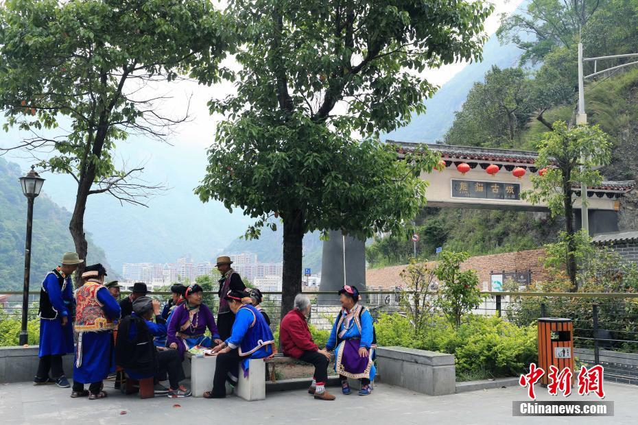 5月8日,老人在“熊猫古城”街头休闲聊天。经历了汶川特大地震、芦山强烈地震以后的四川宝兴县,通过灾后重建着力推进熊猫古城相关配套设施和重要节点建设,将其打造为川西大熊猫生态旅游环线上最具代表性、标志性的精品旅游景区。 中新社记者 王磊 摄