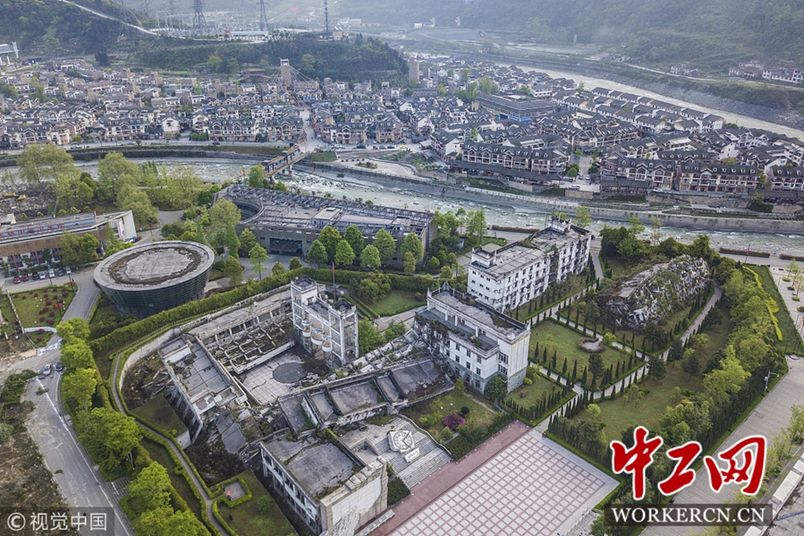 位于震中的映秀镇在地震中被严重损毁,如今漩口中学地震遗址旁,已建造起一排排坚固整齐的房屋。