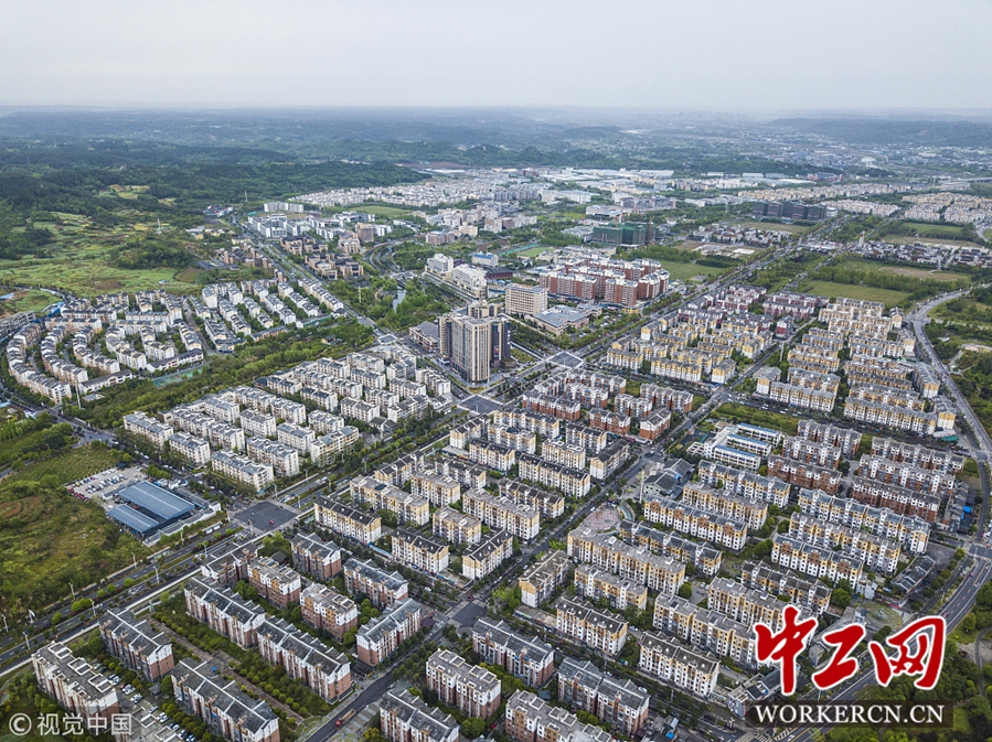 异地重新修建的北川新县城,楼房和道路整齐划一。